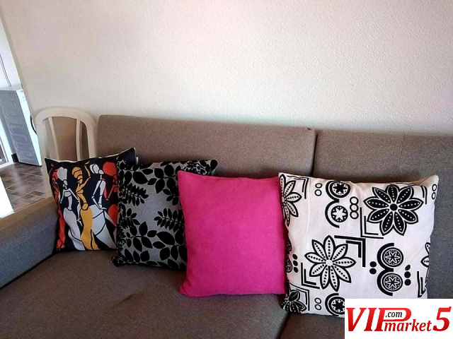 7) Дневна соба со нов еспресо боја ламинат, нов тросед со перници, стоечка лампа, клима (за греење и ладење преку цела година), модерна розева софа, табуретка за седење и маса;